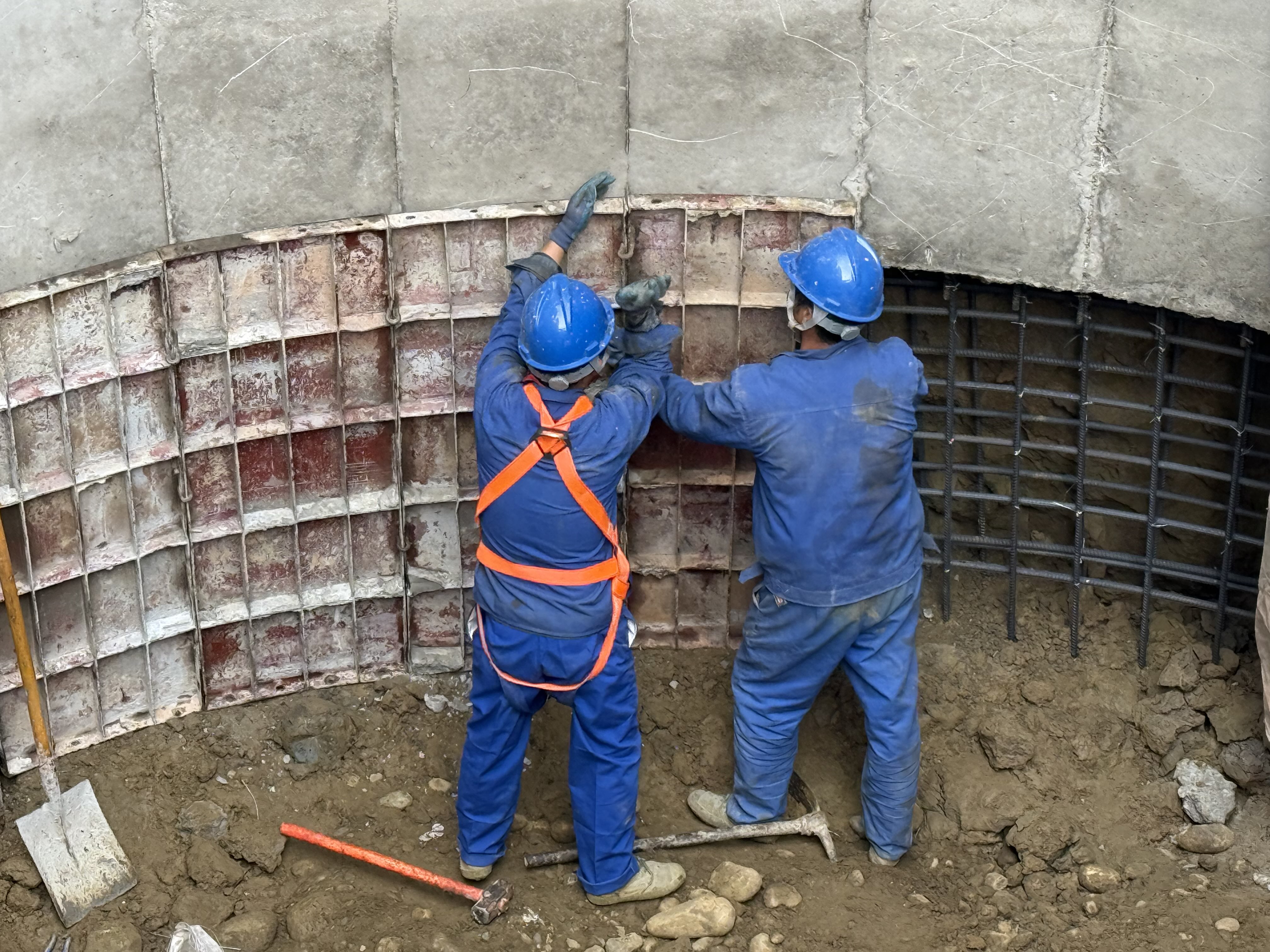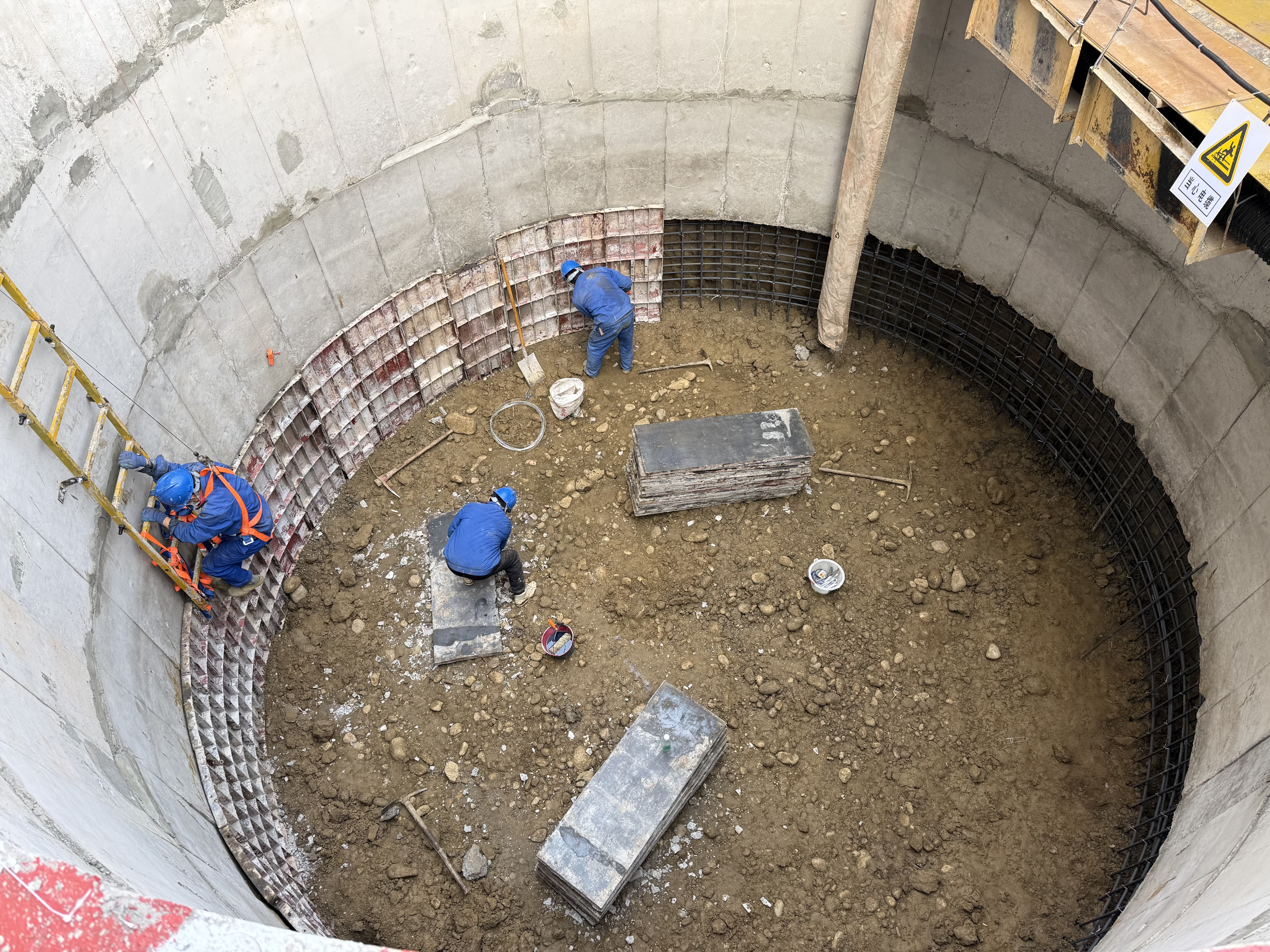 2月5日上午,记者在施工现场看到,数名工人在直径约7米、深约5米的竖井内安装模板、绑扎钢筋,浇筑混凝土。业主项目经理邓克愚介绍,每次挖掘深度约1米,等3天左右混凝土凝固后,继续向下挖掘,再重复安装模板、绑扎钢筋、浇筑混凝土,直到挖到预定深度11米。之后,再用专用机械横向挖掘隧道,最后再安装电缆。